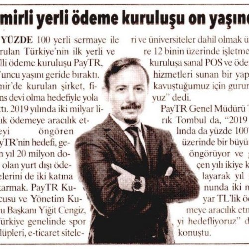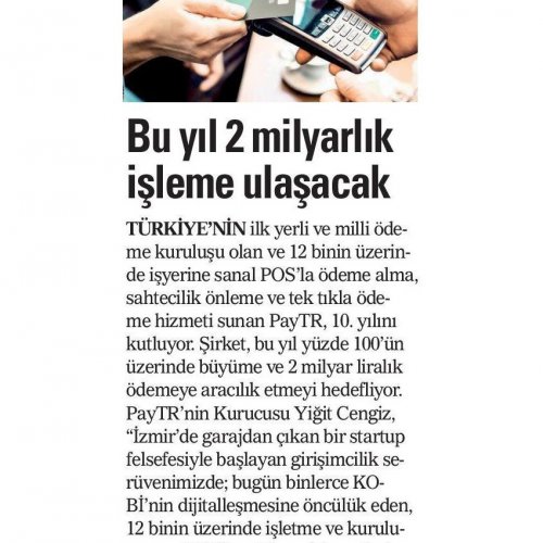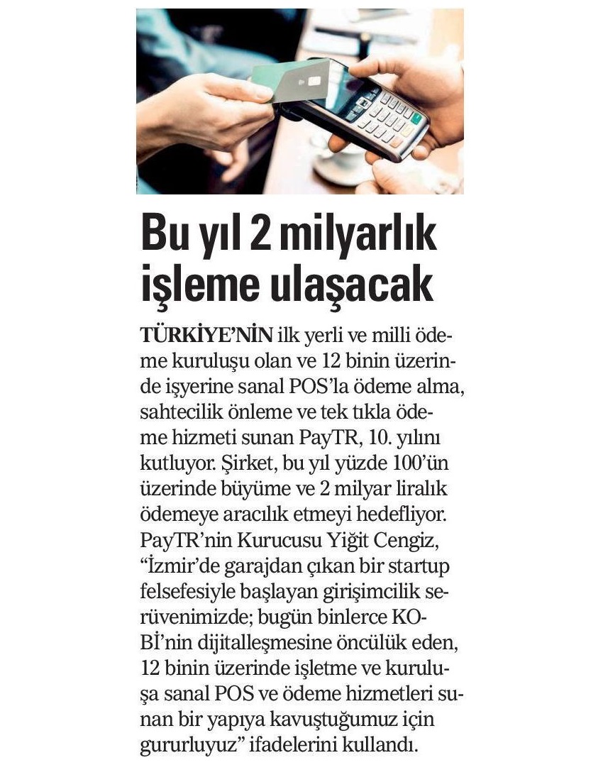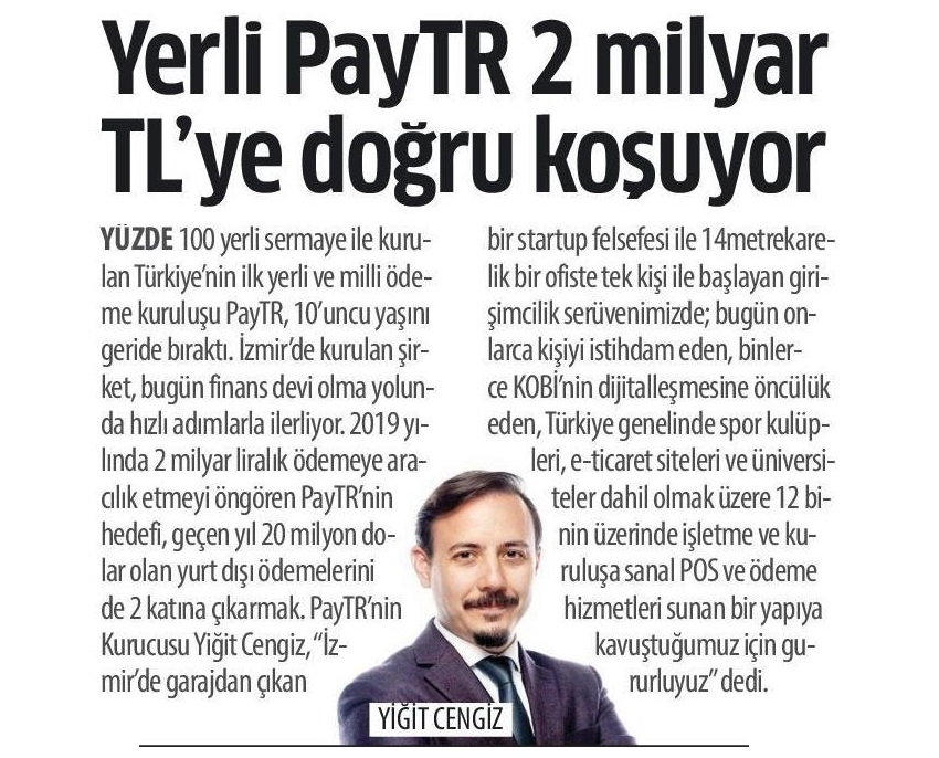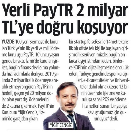 Yüzde 100 yerli sermaye ile kurulan Türkiye'nin ilk yerli ve milli ödeme kuruluşu PayTR, 10'uncu yaşını geride bıraktı. İzmir'de kurulan şirket, bugün finans devi olma yolunda hızlı adımlarla ilerliyor. 2019 yılında 2 milyar liralık ödemeye aracılık etmeyi öngören PayTR'nin hedefi, geçen yıl 20 milyon dolar olan yurt dışı ödemelerini de 2 katına çıkarmak.