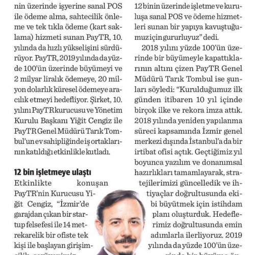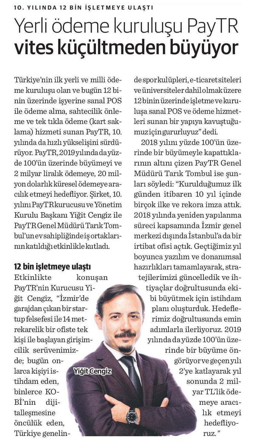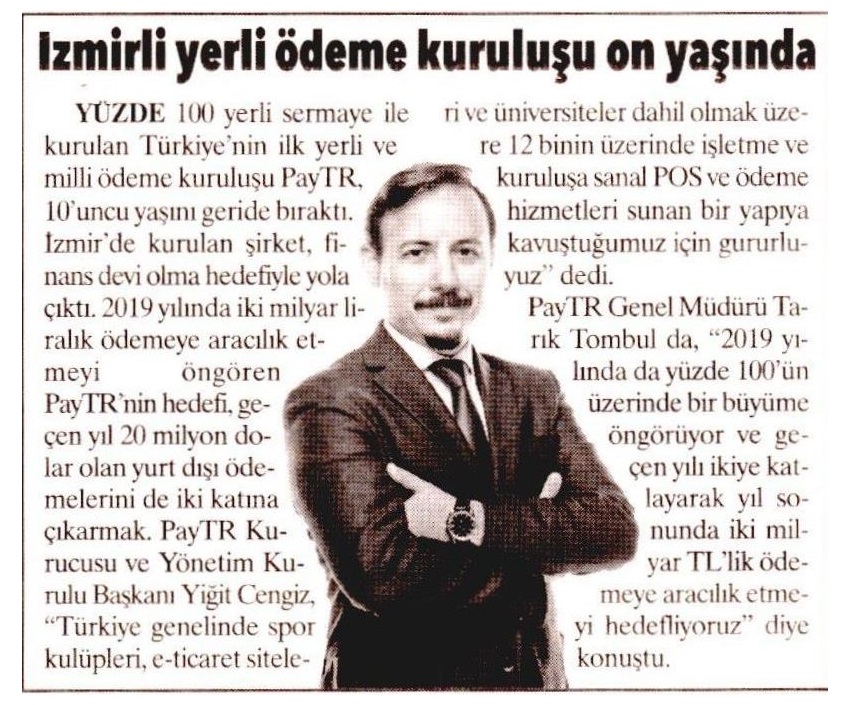2018 yılını yüzde 100'ün üzerinde bir büyümeyle kapattıklarının altını çizen PayTR Genel Müdürü Tarık Tombul ise “Kurulduğumuz ilk günden itibaren 10 yıl içinde birçok ilke ve rekora imza attık. 2018 yılında yeniden yapılanma süreci kapsamında İzmir genel merkezi dışında İstanbul'a da bir irtibat ofisi açtık. Geçtiğimiz yıl boyunca yazılım ve donanımsal hazırlıkları tamamlayarak, stratejilerimizi güncelledik ve ihtiyaçlar doğrultusunda ekibi büyütmek için istihdam planı oluşturduk. Hedeflerimiz doğrultusunda emin adımlarla ilerliyoruz. 2019 yılında da yüzde 100'ün üzerinde bir büyüme öngörüyor ve geçen yılı 2'ye katlayarak yıl sonunda 2 milyar TL'lik ödemeye aracılık etmeyi hedefliyoruz. Öte yandan sadece Türkiye'de değil, dünya genelinde de kullanıcılara hizmet sunuyoruz. Geçen yıl 20 milyon dolarlık yurt dışı ödemelerine aracılık ettik. Bu yıl için hedefimiz bu rakamı da 2 katına çıkararak e-ihracata daha çok destek olmak. Yolculuğumuzda bizimle beraber ilerleyen herkese PayTR adına teşekkür ediyorum” dedi.