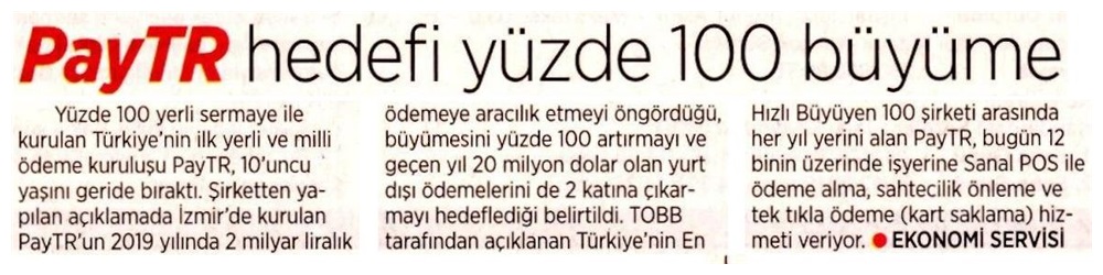 Türkiye'nin ilk yerli ve milli ödeme kuruluşu olan ve bugün 12 binin üzerinde işyerine Sanal POS ile ödeme alma, sahtecilik önleme ve tek tıkla ödeme (kart saklama) hizmeti sunan PayTR, 10. yılında da hızlı yükselişini sürdürüyor. Türkiye Odalar ve Borsalar Birliği (TOBB) tarafından açıklanan Türkiye'nin En Hızlı Büyüyen 100 şirketi arasında her yıl yerini alan PayTR, 2019 yılında da yüzde 100'ün üzerinde büyümeyi ve 2 milyar liralık ödemeye, 20 milyon dolarlık küresel ödemeye aracılık etmeyi hedefliyor.