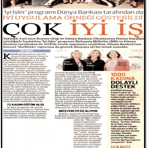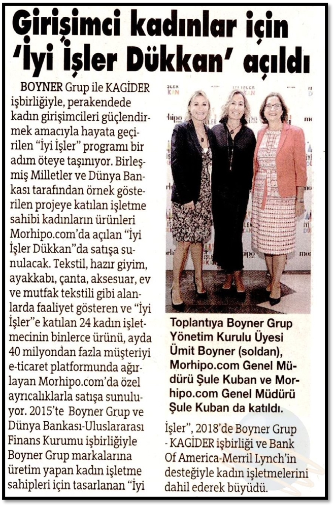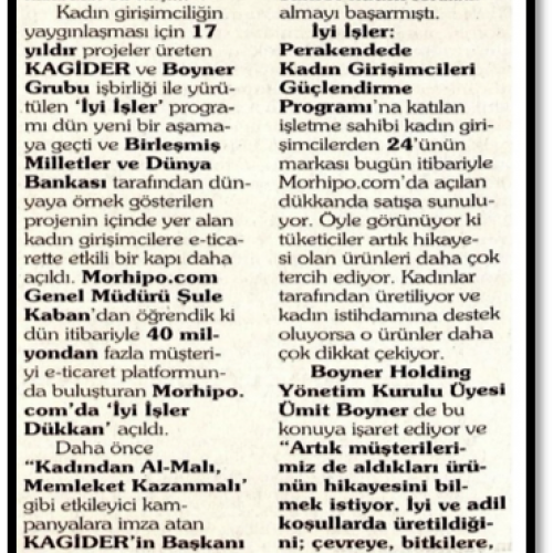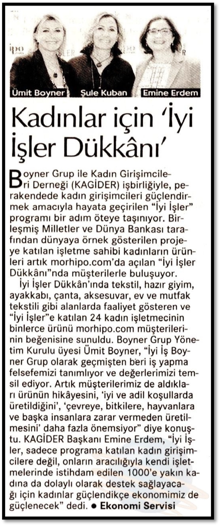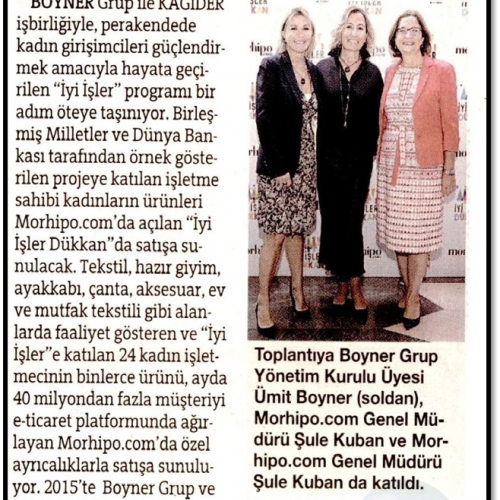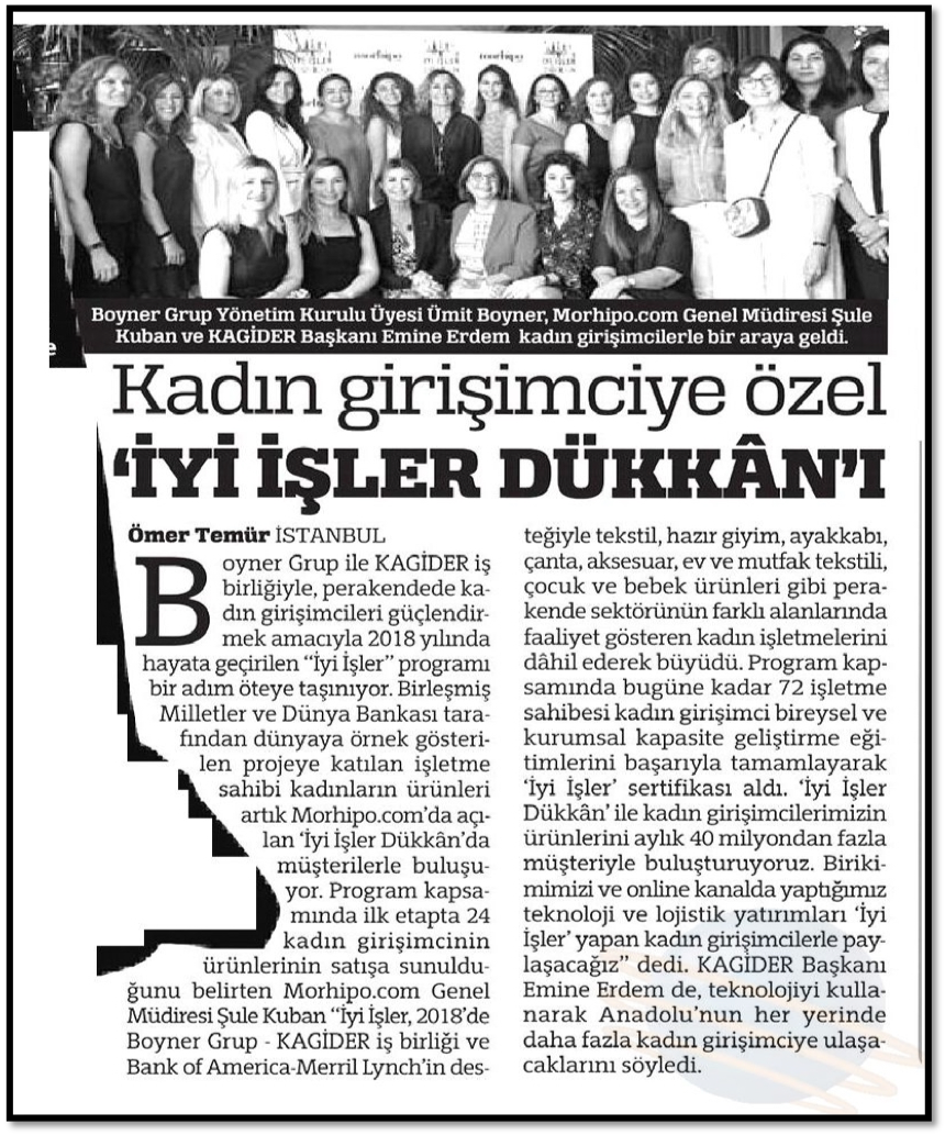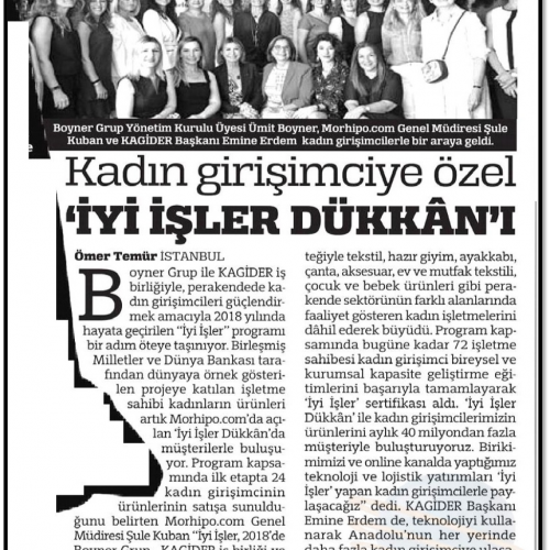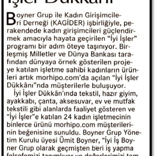Boyner Grup ve KAGİDER ortaklığıyla kadın girişimcilere destek olmak için gerçekleştirilen “İyi İşler: Perakendede Kadın Girişimcileri Güçlendirme Programı”na katılan işletme sahibi girişimci kadınların ürünleri bundan böyle modanın e-ticaretteki adresi Morhipo.com’da açılan İyi İşler Dükkan’da satışa çıkıyor. İyi İşler Dükkan’da tekstil, hazır giyim, ayakkabı, çanta, aksesuar, ev ve mutfak tekstili gibi alanlarda faaliyet gösteren ve “İyi İşler”e katılan 24 kadın işletmecinin binlerce ürünü Morhipo.com müşterilerinin beğenisine sunuldu. Bu ürünler aylık olarak 40 milyondan fazla müşteriyi e-ticaret platformunda ağırlayan Morhipo.com’da özel ayrıcalıklarla satışa sunuluyor.