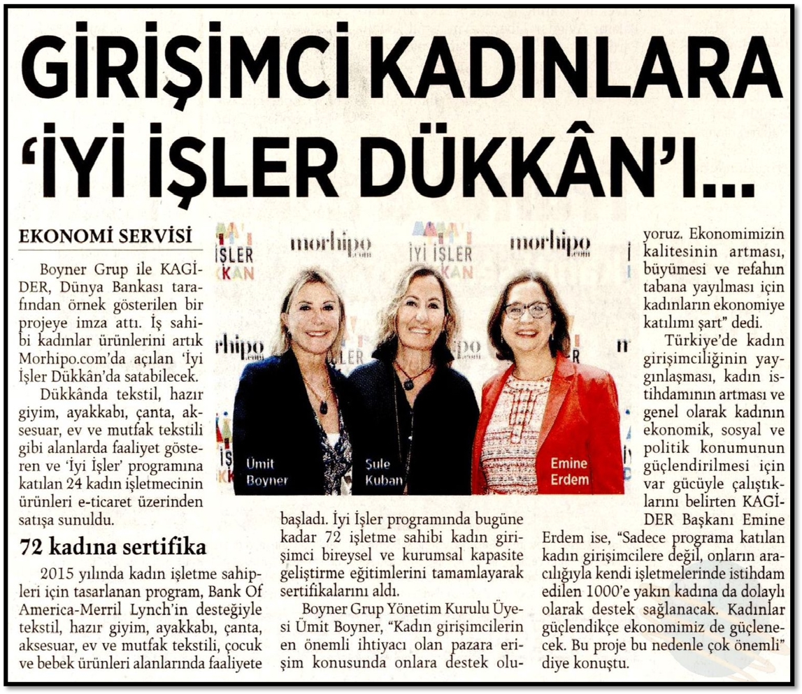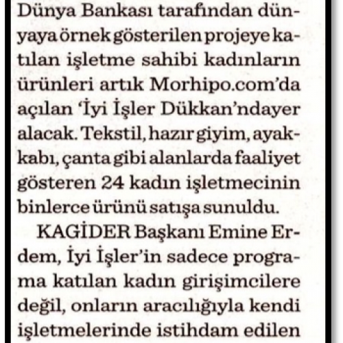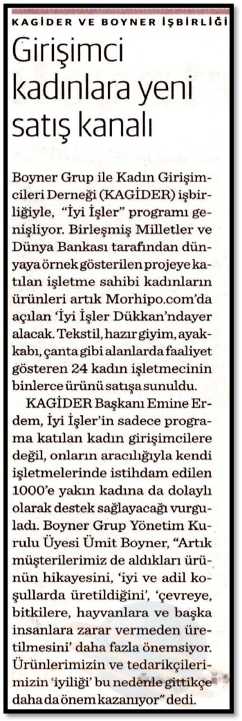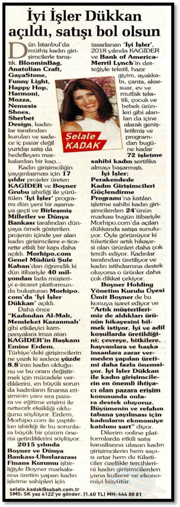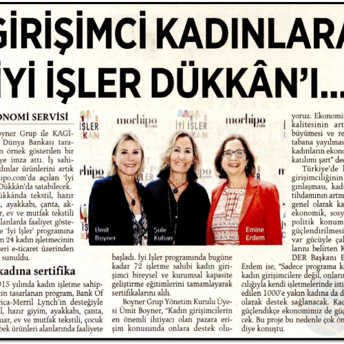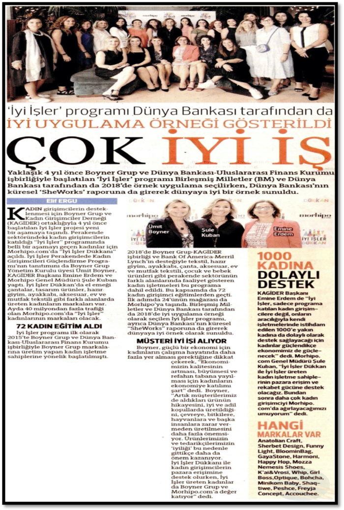 Boyner Grup ve KAGİDER ortaklığıyla kadın girişimcilere destek olmak için gerçekleştirilen “İyi İşler: Perakendede Kadın Girişimcileri Güçlendirme Programı”na katılan işletme sahibi girişimci kadınların ürünleri bundan böyle modanın e-ticaretteki adresi Morhipo.com’da açılan İyi İşler Dükkan’da satışa çıkıyor. İyi İşler Dükkan’da tekstil, hazır giyim, ayakkabı, çanta, aksesuar, ev ve mutfak tekstili gibi alanlarda faaliyet gösteren ve “İyi İşler”e katılan 24 kadın işletmecinin binlerce ürünü Morhipo.com müşterilerinin beğenisine sunuldu. Bu ürünler aylık olarak 40 milyondan fazla müşteriyi e-ticaret platformunda ağırlayan Morhipo.com’da özel ayrıcalıklarla satışa sunuluyor.
