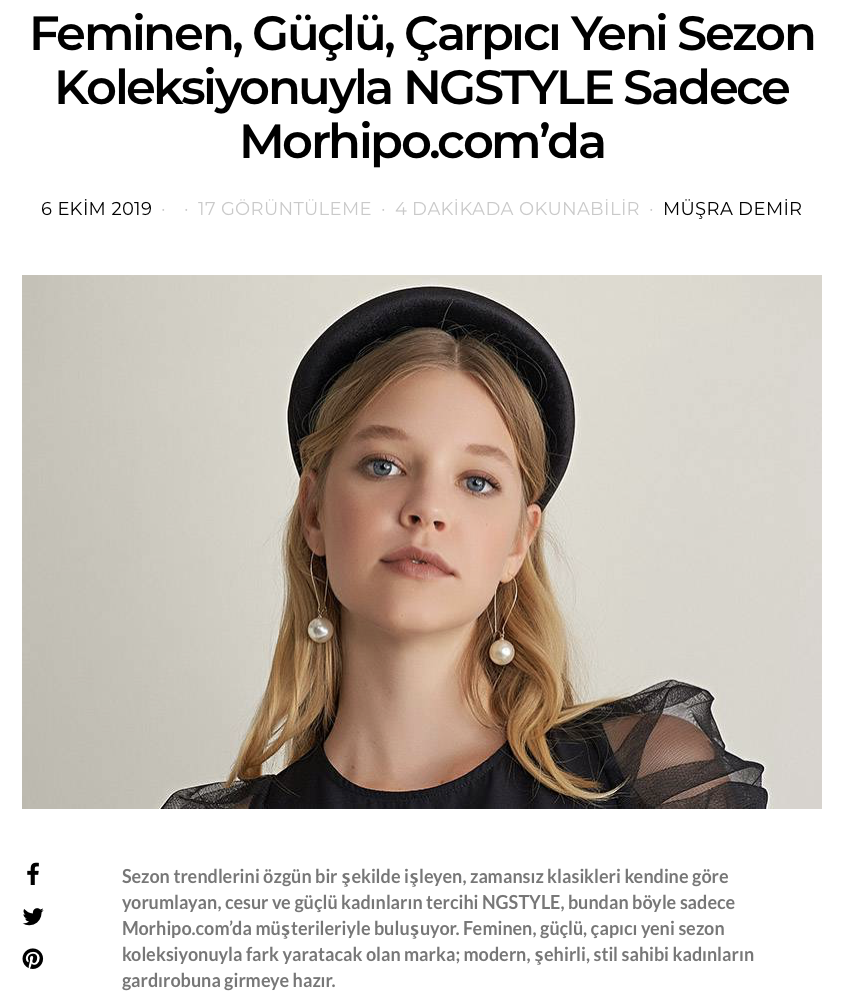 Sezon trendlerini özgün bir şekilde işleyen, zamansız klasikleri kendine göre yorumlayan, cesur ve güçlü kadınların tercihi NGSTYLE, bundan böyle sadece Morhipo.com’da müşterileriyle buluşuyor. Feminen, güçlü, çapıcı yeni sezon koleksiyonuyla fark yaratacak olan marka; modern, şehirli, stil sahibi kadınların gardırobuna girmeye hazır.